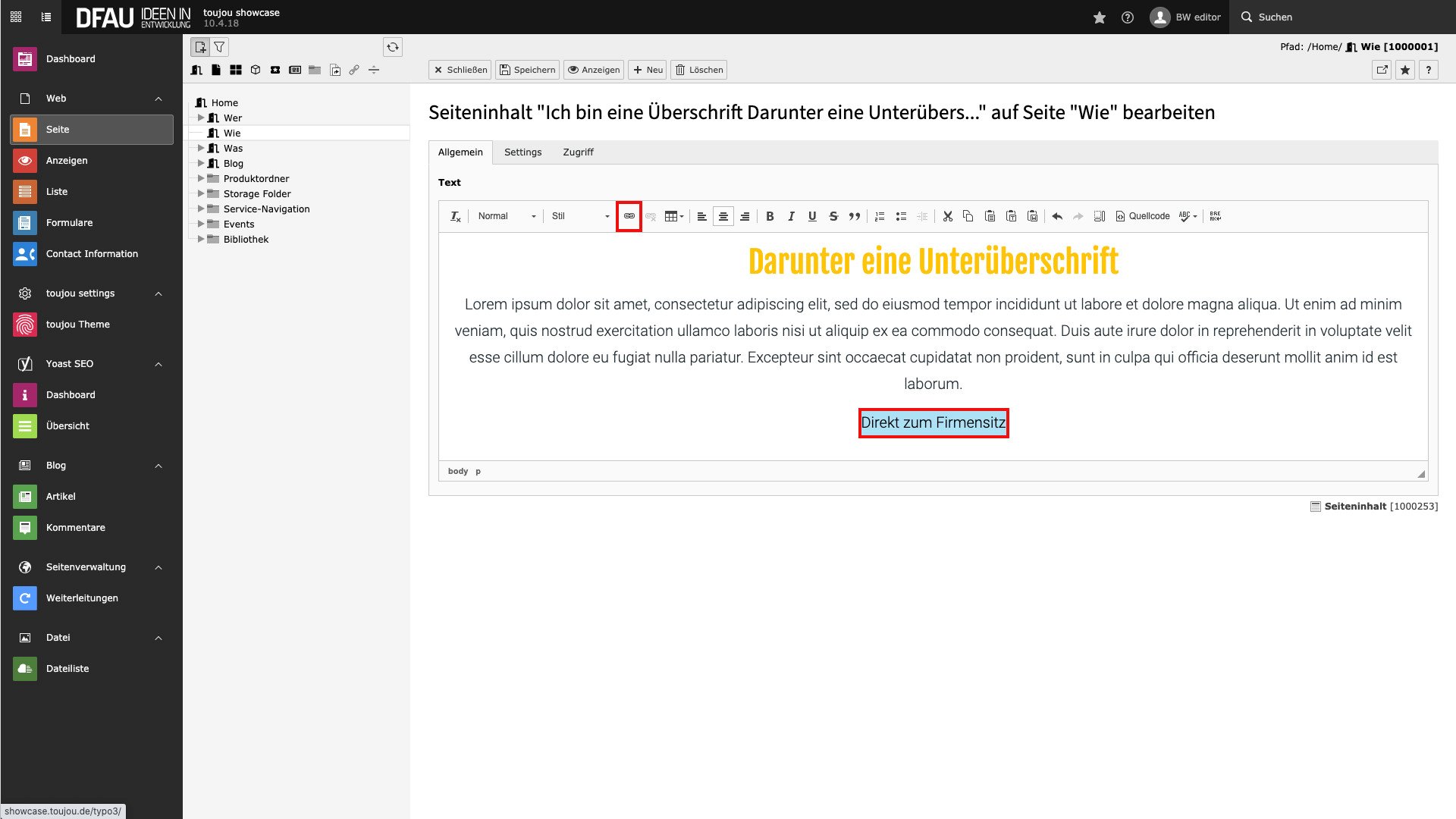 - Verlinkt werden würde auf o.g. Element demzufolge mit #c1000258, das der URL der Unterseite nach einem Schrägstrich manuell angefügt wird. In unserem Beispiel: showcase.toujou.de/wie/#c1000258.