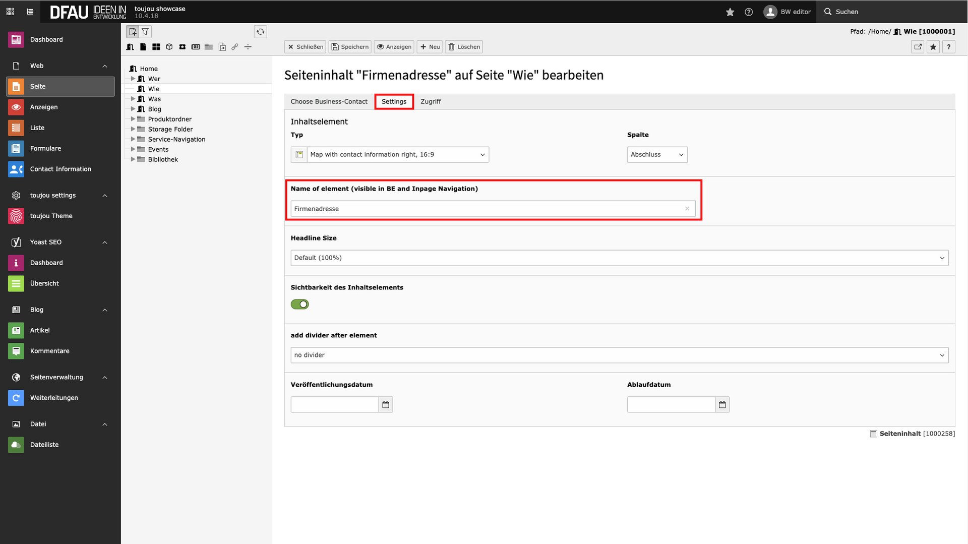 In unserem Beispiel benennen wir das Map-Element mit der Bezeichnung »Firmenadresse«. Diese Überschrift ist nicht im Frontend sichtbar.