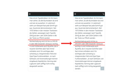 Dies ist vor allem bei mobilen Endgeräten und in Tabellen relevant. Wenn eine Zeile (je nach Endgerät) im Frontend an einem weichen Trennzeichen umgebrochen wird, wird ein Trennstrich am Ende der ersten Zeile stehen. Findet kein Umbruch statt, wird kein Trennstrich ausgespielt.