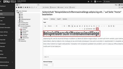 Wenn Sie in einem Element ein Wort aufgrund seiner Länge trennen wollen ohne einen Bindestrich zu verwenden, nutzen Sie das HTML-Tag <wbr/>. Klicken Sie hierfür an der gewünschten Stelle des Wortes auf das Break-Icon, um den Zeilenumbruch zu erzwingen.