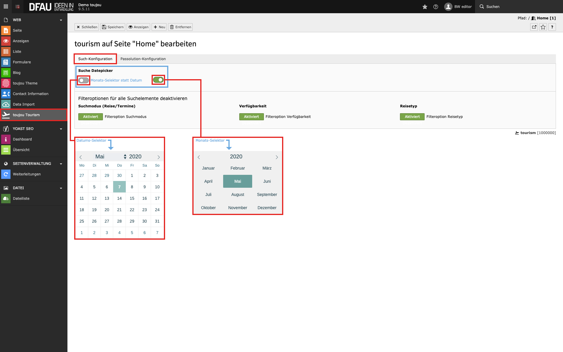 - Im Reiter Such-Konfiguration haben Sie im Bereich Suche Datepicker die Möglichkeit, die standardmäßig eingestelle Datums-Auswahl mit der Monatsauswahl zu ersetzen. Hierfür stellen Sie den Schalter zu Monats-Selektor statt Datum auf Grün.