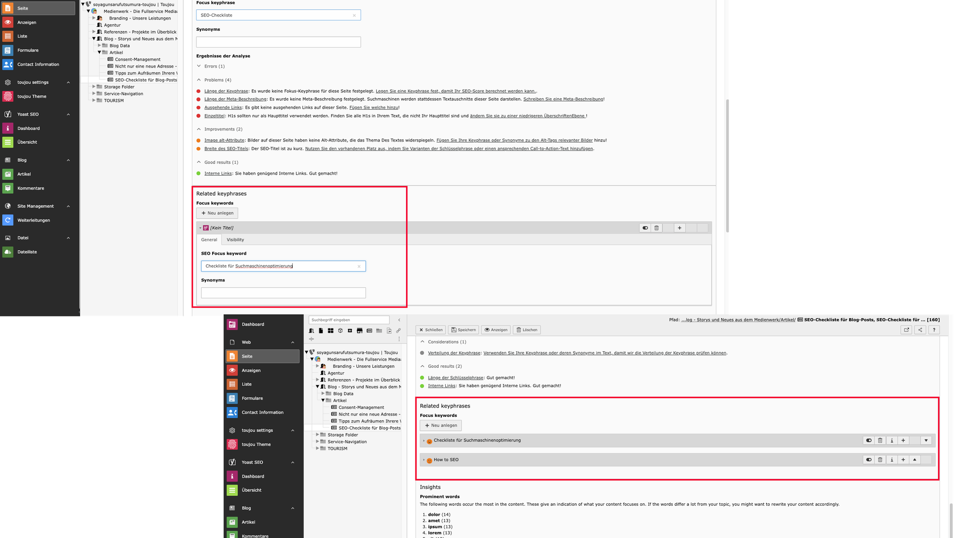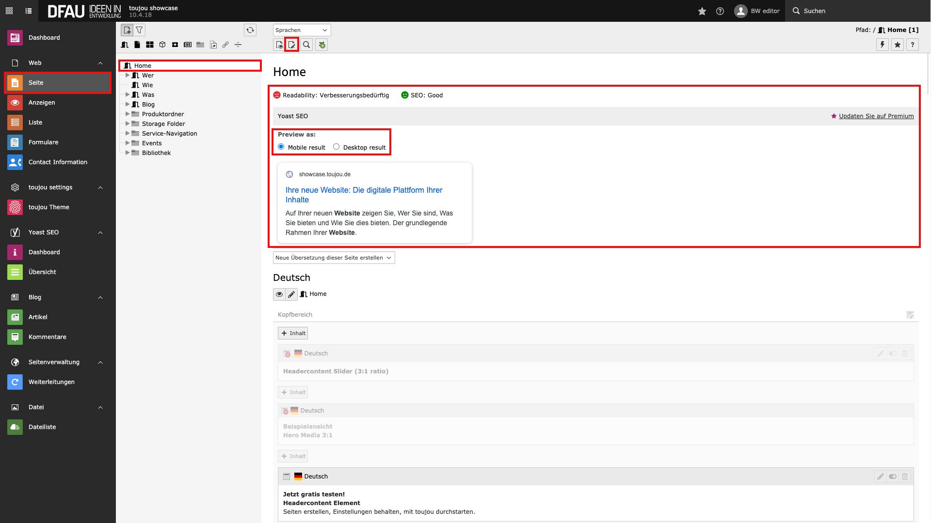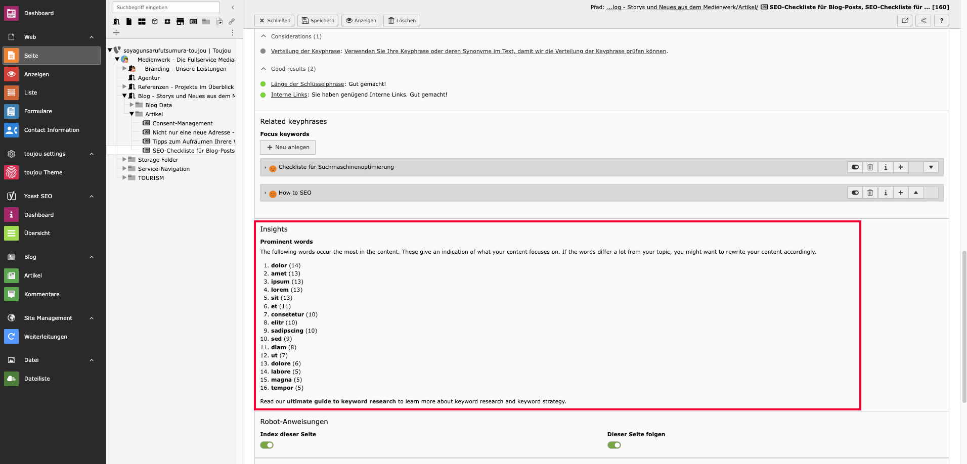 ACHTUNG: Für toujou-Kunden stellt sich das Backend aufgrund der Yoast-SEO-Extension grundlegend anders dar, die gezeigten Funktionen werden zum Teil an anderer Stelle bearbeitet.