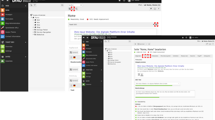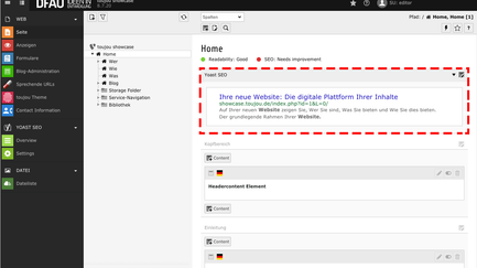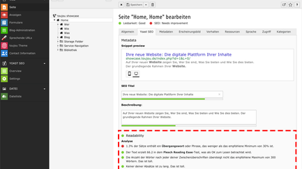- Sobald Sie eine einzelne Seite im Seitenbaum anklicken, erscheint der Inhaltsbereich, über dem die Yoast-Ampelstellungen für Readability und SEO angezeigt werden.