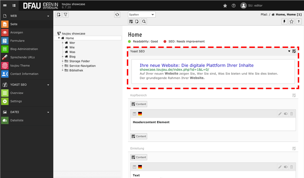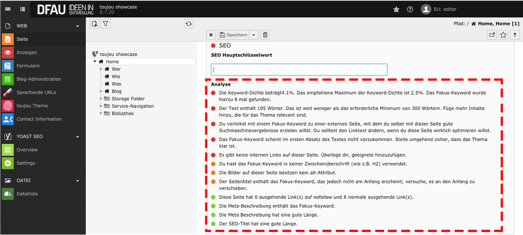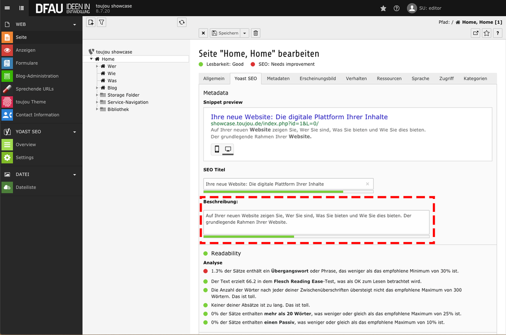 In toujou (TYPO3-Version 8 LTS) bearbeiten Sie sowohl die Inhalte als auch die hinterlegten Metadaten oder Keywords nach SEO-Kriterien. Mit Yoast SEO prüfen und optimieren Sie Schritt für Schritt jede Seite Ihrer gesamten Website. Hierbei geht es nur partiell um die Einstellung von Seiteneigenschaften, das passiert an anderer Stelle. Für das Tutorial der neueren Version 10 LTS klicken Sie bitte hier.