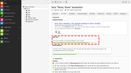 Links in der Menüleiste des Backends finden Sie das Modul Yoast SEO. Die eigentliche Bearbeitung der Suchmaschinenoptimierung erfolgt mit einem Klick auf die Seiteneigenschaften einer jeden Seite im Reiter Yoast SEO.
