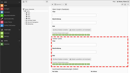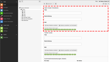 - Titel und Beschreibung ähneln den Einträgen Title und Description, die Sie bereits zu Anfang für diese Seite vorgenommen haben. Hier allerdings wird damit die Anzeige bei Facebook gesteuert. So können Sie beispielsweise ein zu dem Facebook-Link passendes Bild hinterlegen.