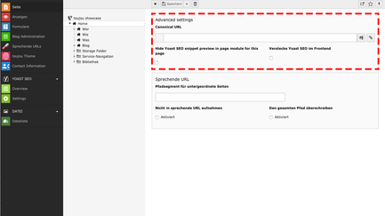 - Mit Nicht in sprechende URL aufnehmen wird die betreffende Seite unsichtbar, ansonsten würde sie automatisch mit in die Sprechende URL übernommen.