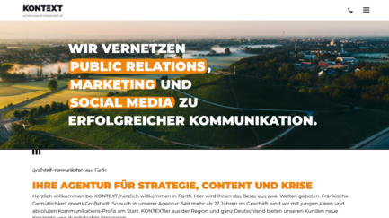 Die KONTEXT public relations GmbH ist eine in Fürth ansässige Kommunikationsagentur. Die fränkischen Kreativköpfe verknüpfen Marketing, Public Relations und Social Media für eine erfolgreiche Kommunikation der Unternehmen und Kommunalpolitiker sowie deren Kampagnen. Für ihre regionalen und bundesweiten Kunden bedienen sie sowohl die Bereiche Strategie und Content als auch die Krisenkommunikation. Dafür erarbeiten sie neue Konzepte und durchdachte Strategien.