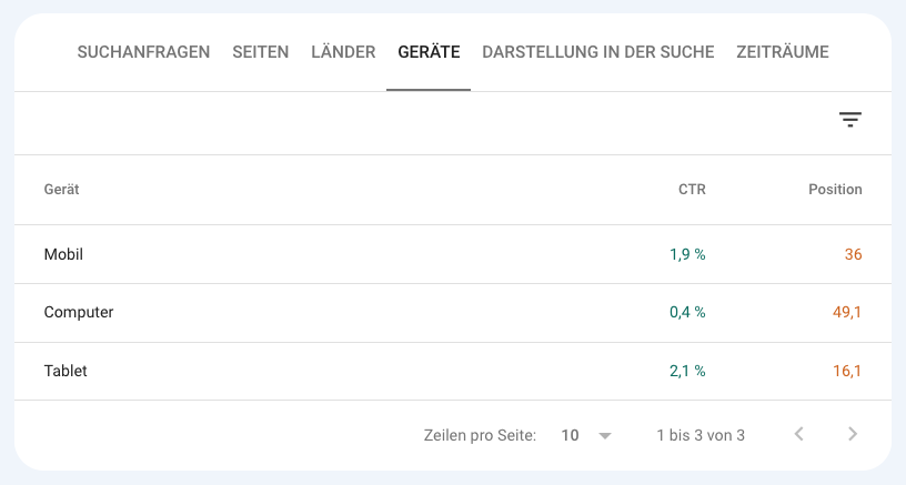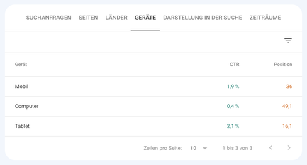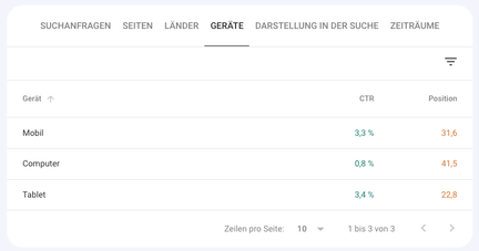 Weniger aussagekräftig aber in der Tendenz auffällig ist auch die ebenfalls verbesserte durchschnittliche Position in den Rankings. Dies gilt sowohl bei mobilen Endgeräten, wo nach vier Monaten Live-Phase die Position aller Suchbegriffe sich im Durchschnitt von 36 auf 31,6 verbesserte. Auch die Position bei Zugriffen von von Laptops und Desktop-Computern hat sich von 49,1 auf 41,5 verbessert. Diese Zahlen sind jedoch deswegen mit Vorsicht zu genießen, da sie Trends unterliegen und ein tagesaktueller Ausreißer Einfluss auf den Gesamtquotienten nehmen kann.