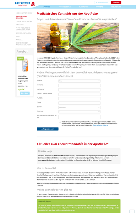 Die MEDICON Apotheke hat mit der Auslagerung des autarken Themengebiets "Medizinisches Cannabis" in ein eigenständiges Portal die Unternehmensstrategie konsequent fortgesetzt. Schon die prominente Platzierung der Landingpage in der Hauptnavigation war Ausdruck dafür, dass die Verantwortlichen sich der Bedeutung des vorhandenen Contents für Interessentinnen und Besucher stets bewusst waren. Zusätzlich verschaffte man sich beim Aus- und Aufbau von Keywords und Landingpages Vorteile als kompetenter Versorger für Schmerzpatienten.