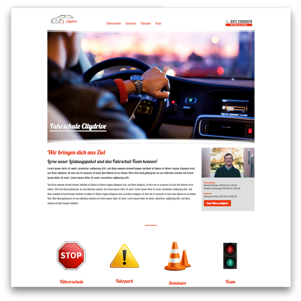 - Startseite: Zeigen Sie in übersichtlicher Weise, was Sie als Fahrlehrer zu bieten haben. Ein kurzer Abriss Ihres Angebots bei den Führerscheinklassen, dem Fuhrpark sowie Hinweise auf Aktuelles geben einen informativen ersten Eindruck. Verwenden Sie, wenn möglich, keine Stock-Bilder, sondern eigene. Reduzieren Sie Texte auf das Minimum.